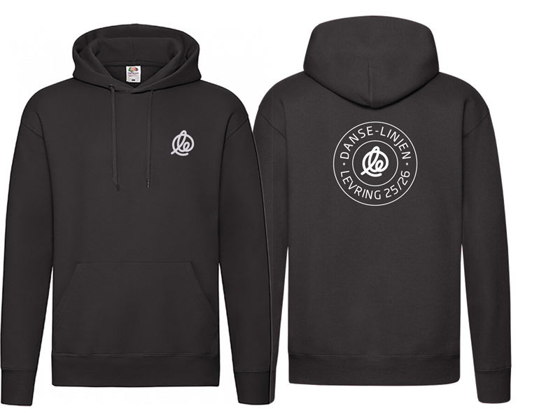 Dansehoodien leveres med lille skolelogo på front samt stort danselinje logo på ryg.